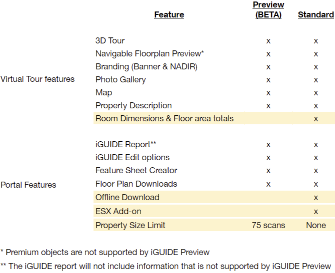 Below we have provided a brief comparison between iGUIDE Preview and iGUIDE Standard features. Important differences are highlighted.