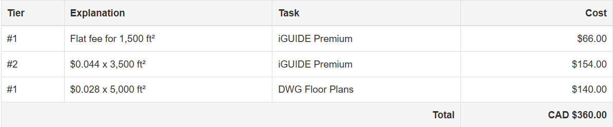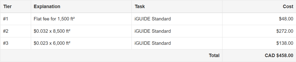 - Processing fees for a single iGUIDE are set by the sum of the fees calculated within each applicable pricing tier. If the billable square footage of an iGUIDE crosses multiple pricing tiers, multiple charge rates will be used in computing the total fees due for that iGUIDE.