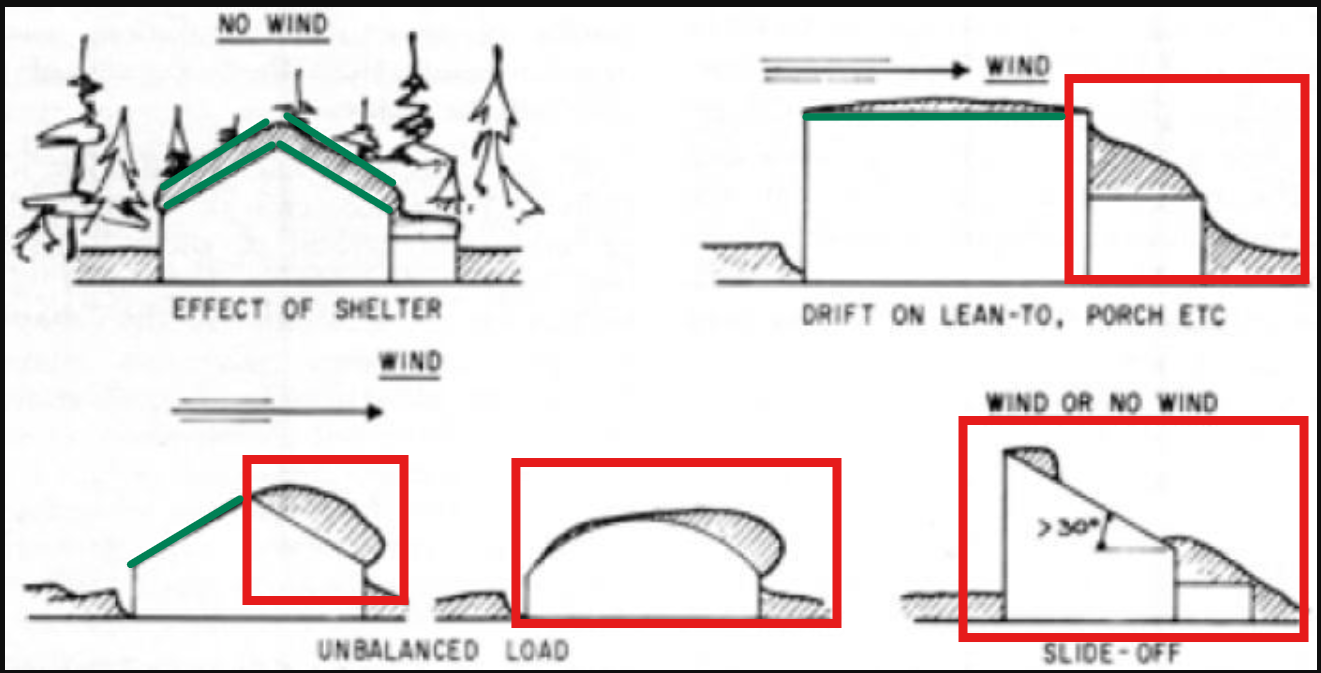 - The roof slope may still show, but the offset from the wall becomes unreliable because the true roof surface is hidden under snow.